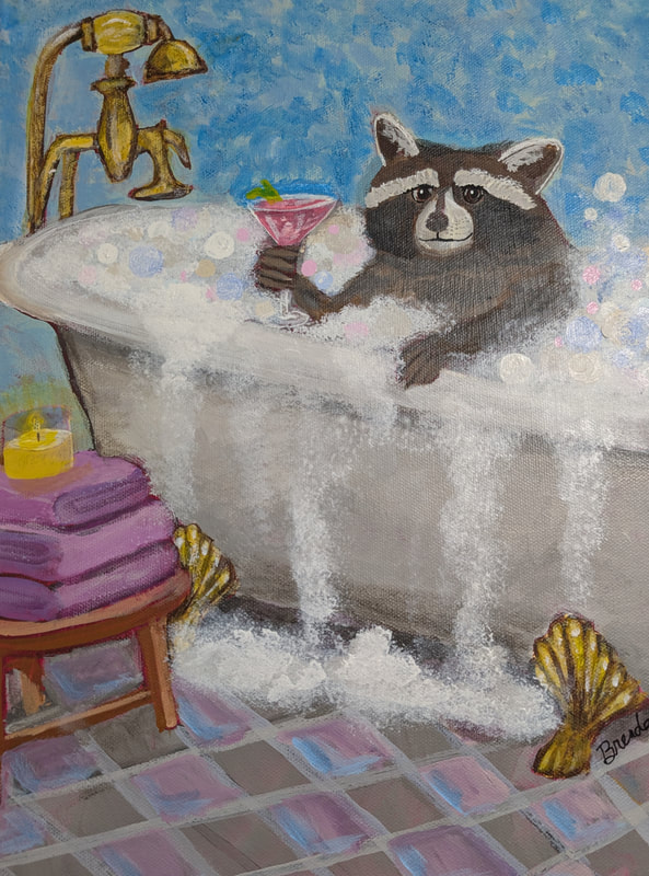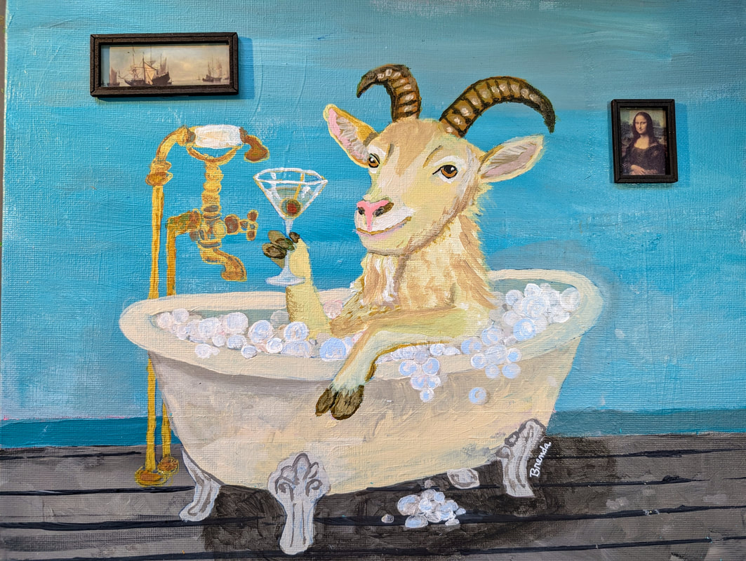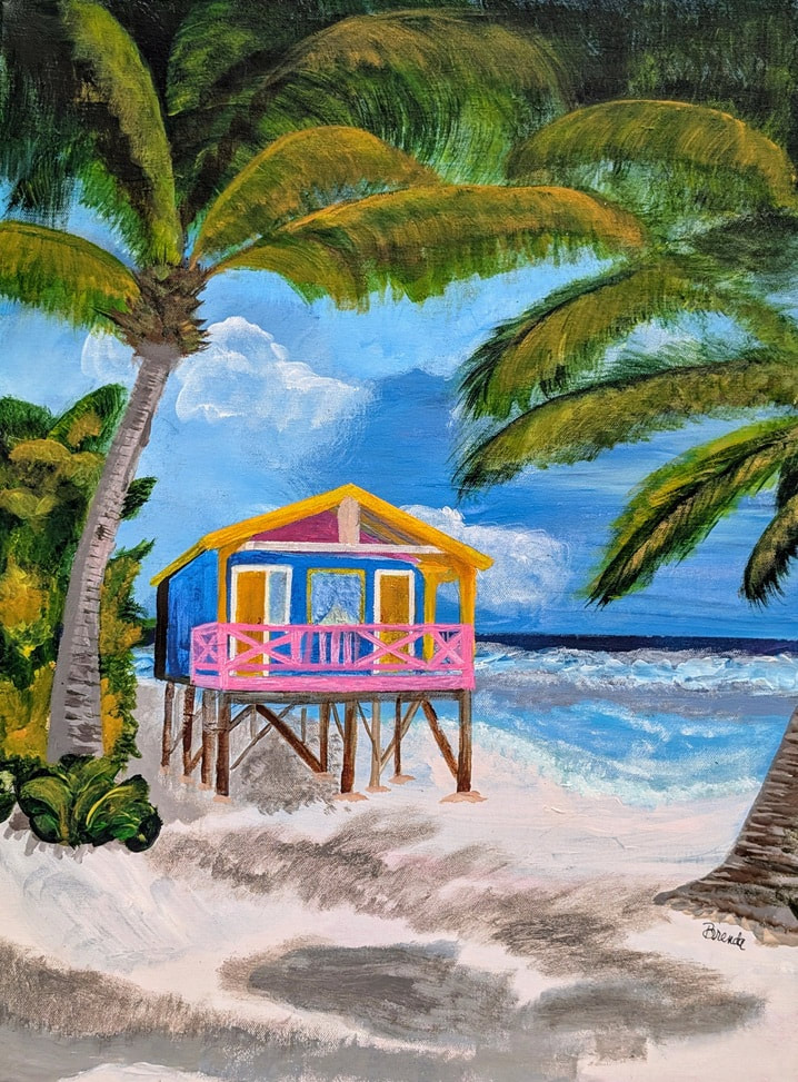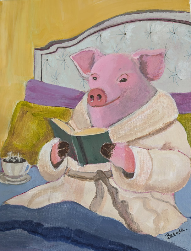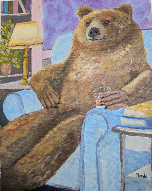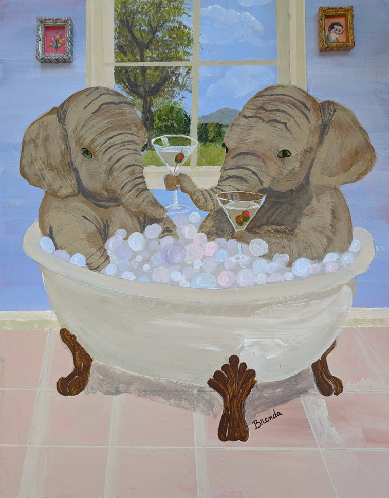 Brenda has been an acrylic painter and mixed media artist since 2016, creating paintings and collages every chance she gets. Her work is defined by a distinctive blend of whimsy, narrative charm, and painterly sophistication. Her paintings often feature animals placed in unexpectedly human moments—bathing, reading, resting, or quietly reflecting—inviting viewers into scenes that feel both playful and deeply relatable. These compositions balance gentle humor with emotional warmth, creating a sense of calm, comfort, self-care, and quiet joy. She also loves to paint tropical landscapes.