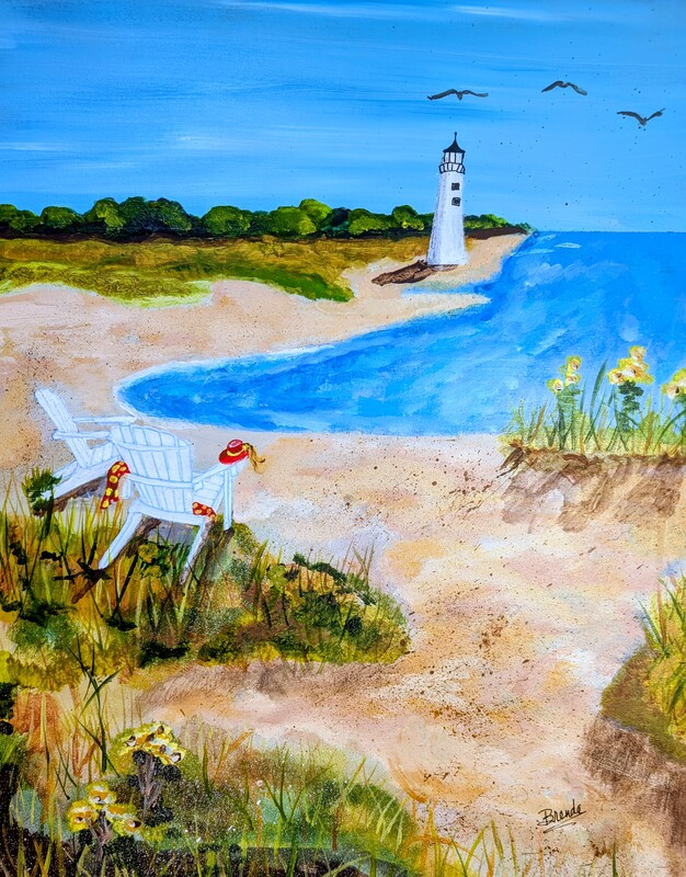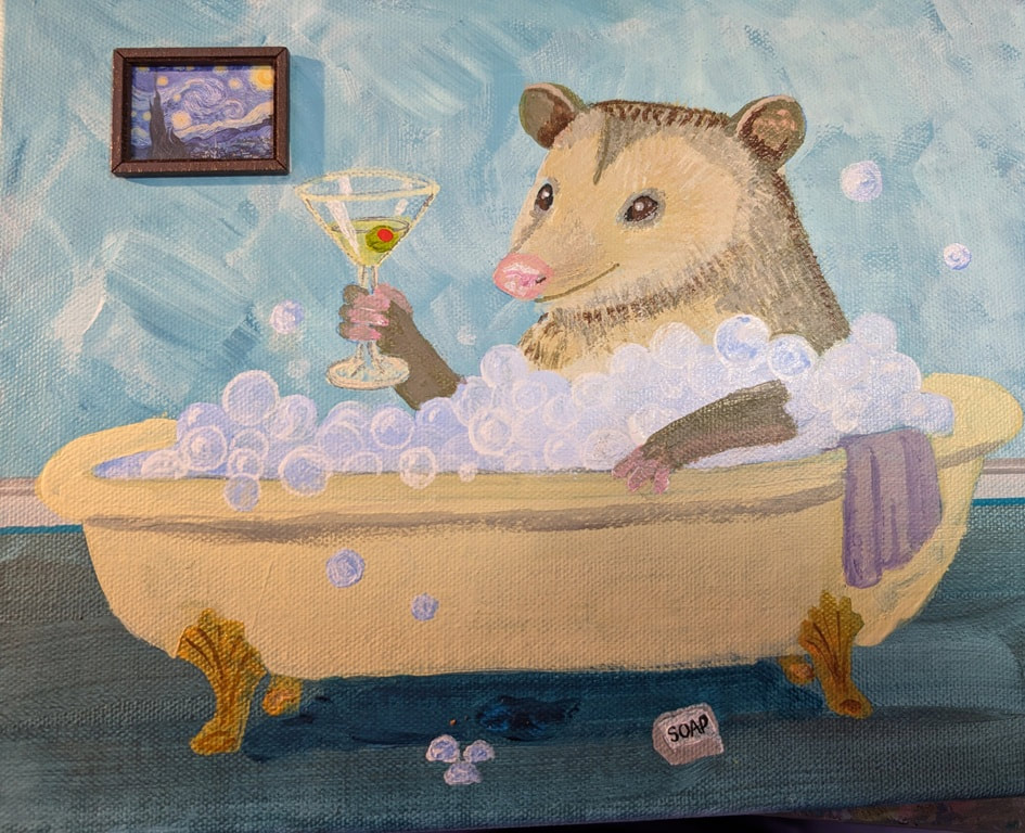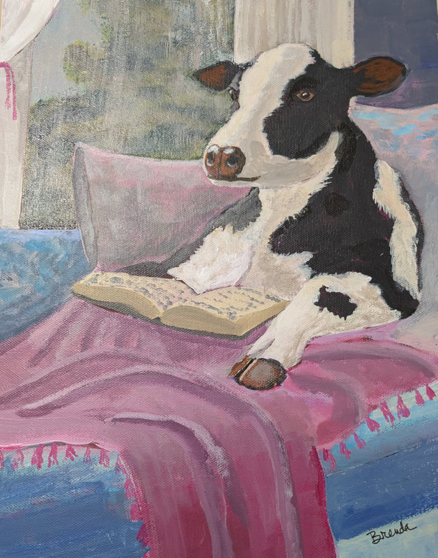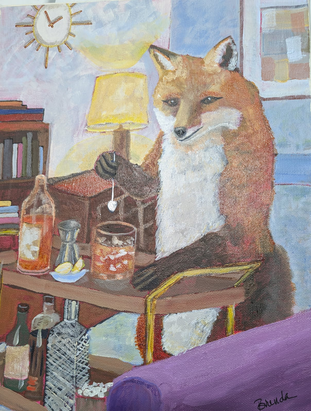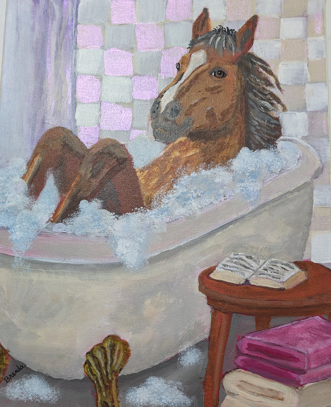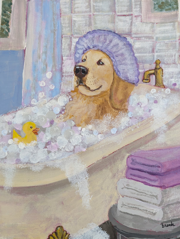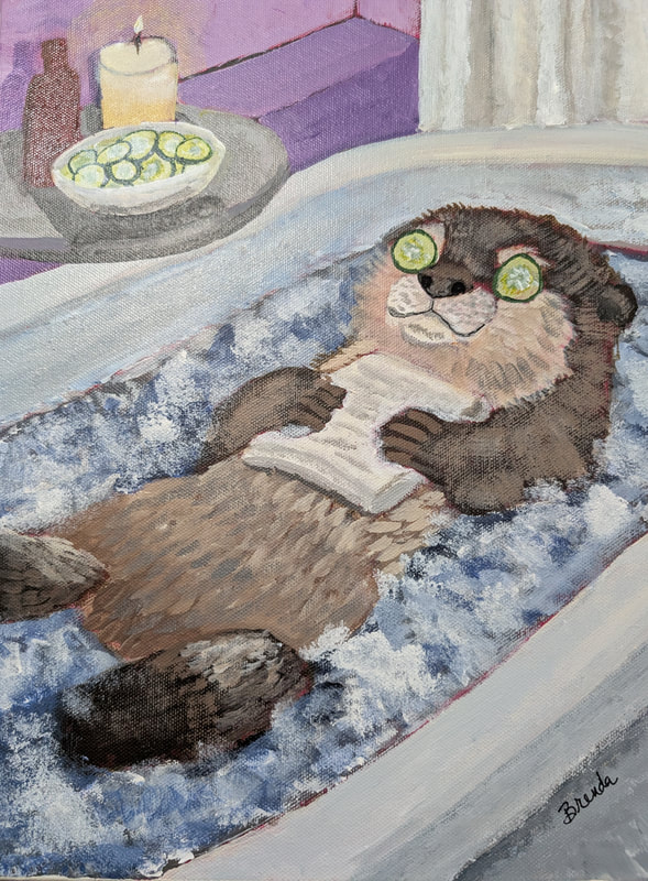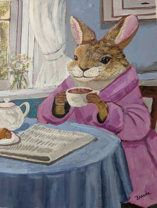 Brenda has been an acrylic painter and mixed media artist since 2016, creating paintings and collages every chance she gets. Her work is defined by a distinctive blend of whimsy, narrative charm, and painterly sophistication. Her paintings often feature animals placed in unexpectedly human moments—bathing, reading, resting, or quietly reflecting—inviting viewers into scenes that feel both playful and deeply relatable. These compositions balance gentle humor with emotional warmth, creating a sense of calm, comfort, self-care, and quiet joy. She also loves to paint tropical landscapes.