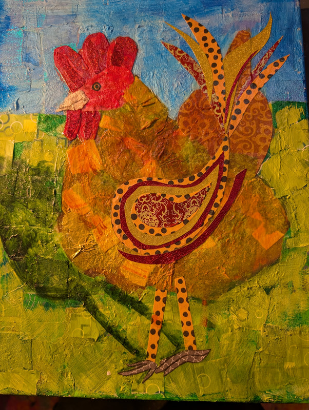 Brenda layers acrylics, collage elements, and expressive mark-making to build surfaces rich with texture and visual interest. Her color palette is widely varied, sometimes leaning toward soft hues, and other times leaning toward bright, saturated colors. Subtle patterns, thoughtful details, and carefully considered negative space give her work a sense of intentional simplicity without sacrificing depth. Each piece suggests a story without fully explaining it, allowing viewers to project their own emotions and experiences onto the scene. Her animal paintings are not caricatures; instead, they possess personality, dignity, and a quiet humanity that makes them feel familiar and endearing.