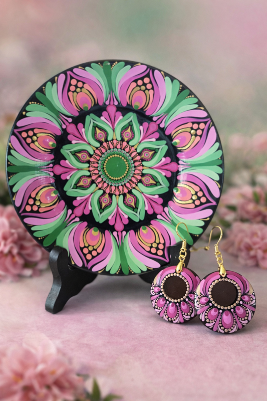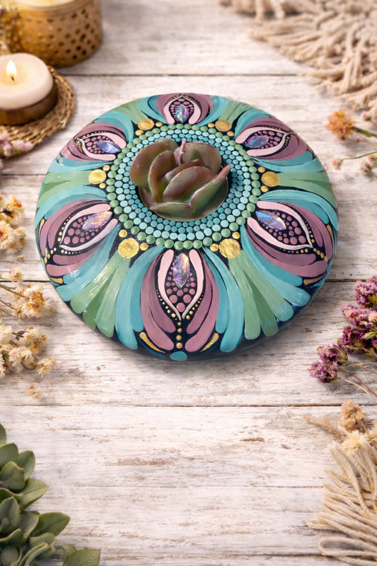 Her artwork is deeply personal and spiritual. She describes dot painting as a therapeutic process, a time for reflection and prayer. When working with alcohol inks, she embraces both control and unpredictability, allowing the inks to form stunning, organic designs.